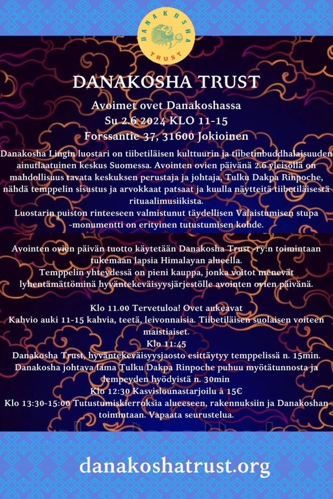 Su 2.6.24 Danakosha Ling: Avoimet ovet / Open House event May 17, 2024May 17, 2024 by danakoshatrust Share this: Click to share on X (Opens in new window) X Click to share on Facebook (Opens in new window) Facebook Like Loading... Related